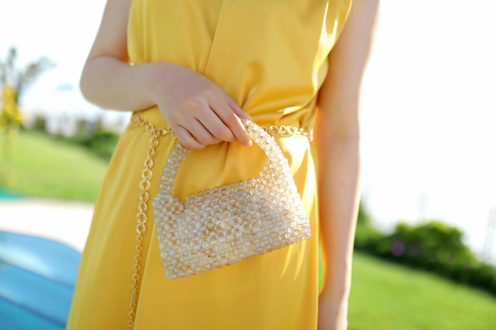 Uzun zincir kollu kapaklı inci çanta beyaz