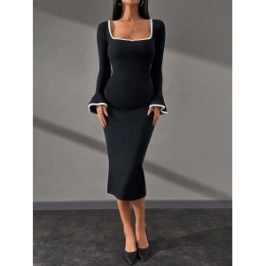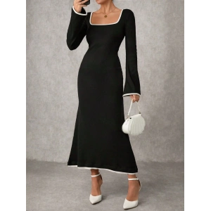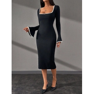 V yaka Uzun kollu midi boy elbise siyah A3154