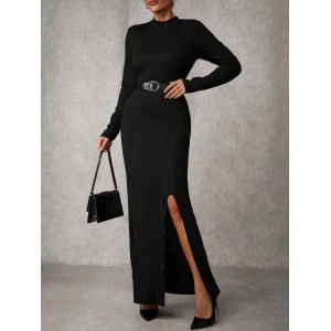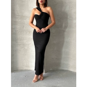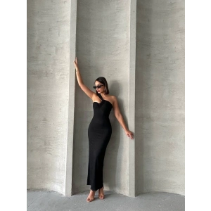 Yırtmaçlı jakarlı uzun elbise siyah A3793