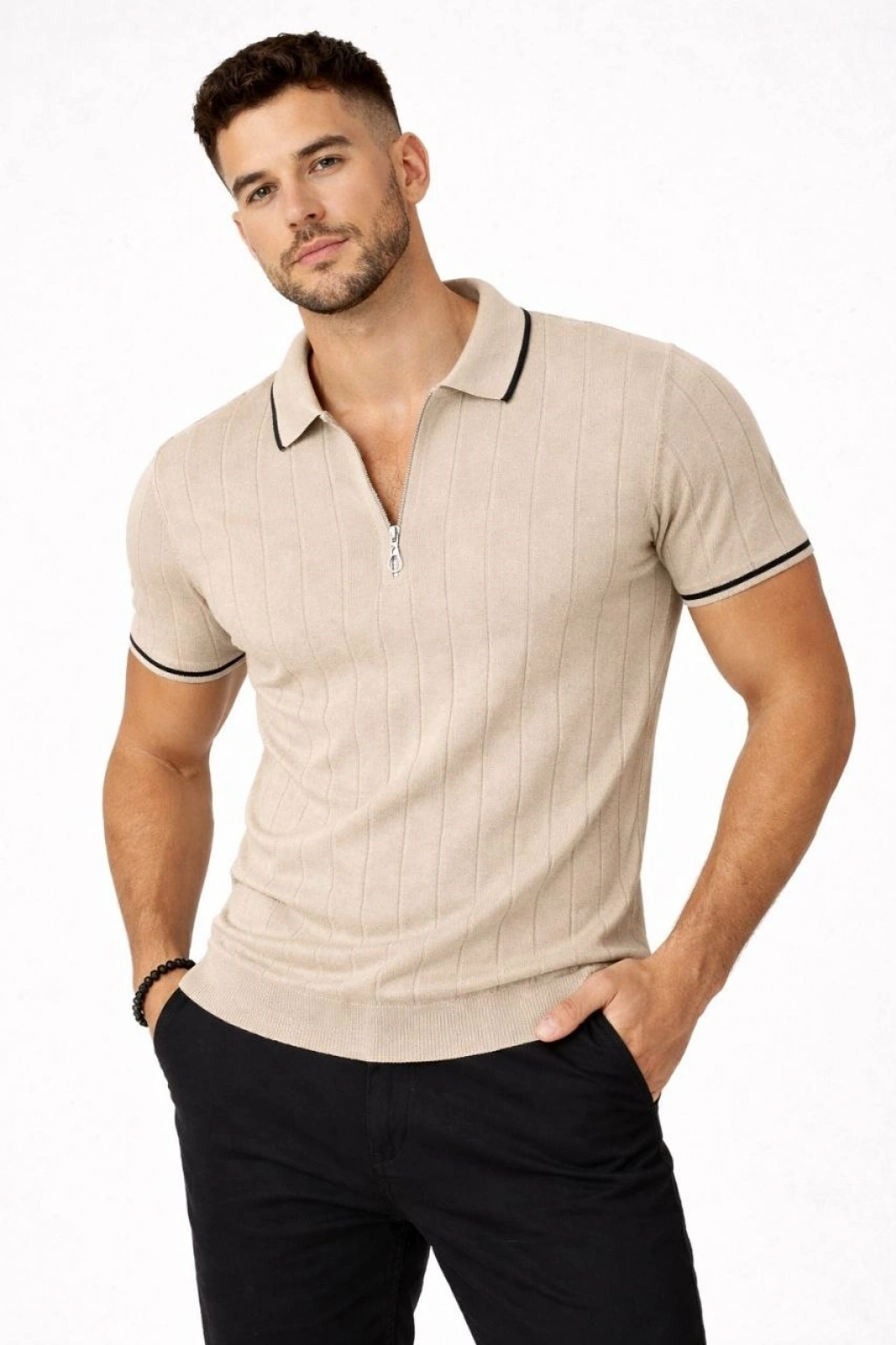 Erkek 2’li Paket Dokuma Triko Fermuarlı Yakalı Fitilli Kısa Kollu Regular Fit Tişört - Bej & Siyah