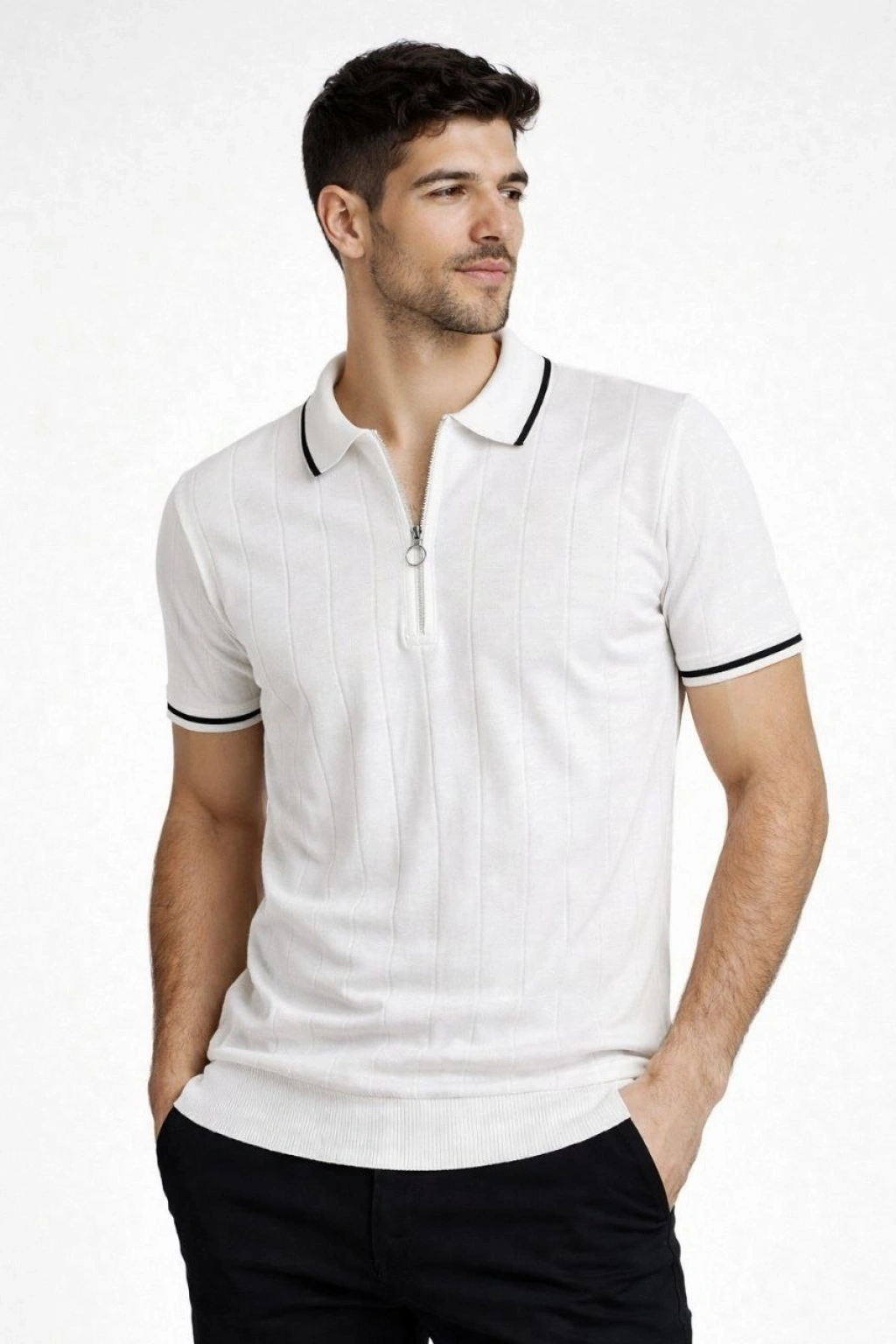 Erkek 2’li Paket Dokuma Triko Fermuarlı Yakalı Fitilli Kısa Kollu Regular Fit Tişört - Beyaz & Siyah