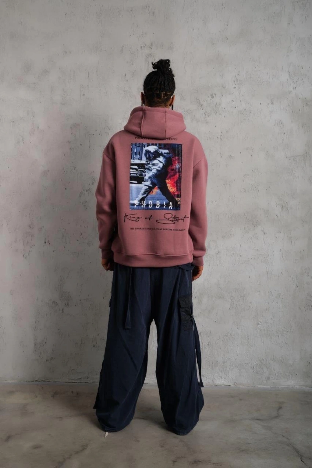Erkek Şimşek Baskılı Kapşonlu Sweatshirt Üç İplik Pamuklu Kanguru Cepli Double Oversize Hoodie - Füme