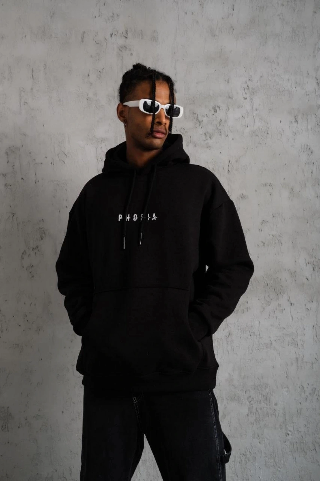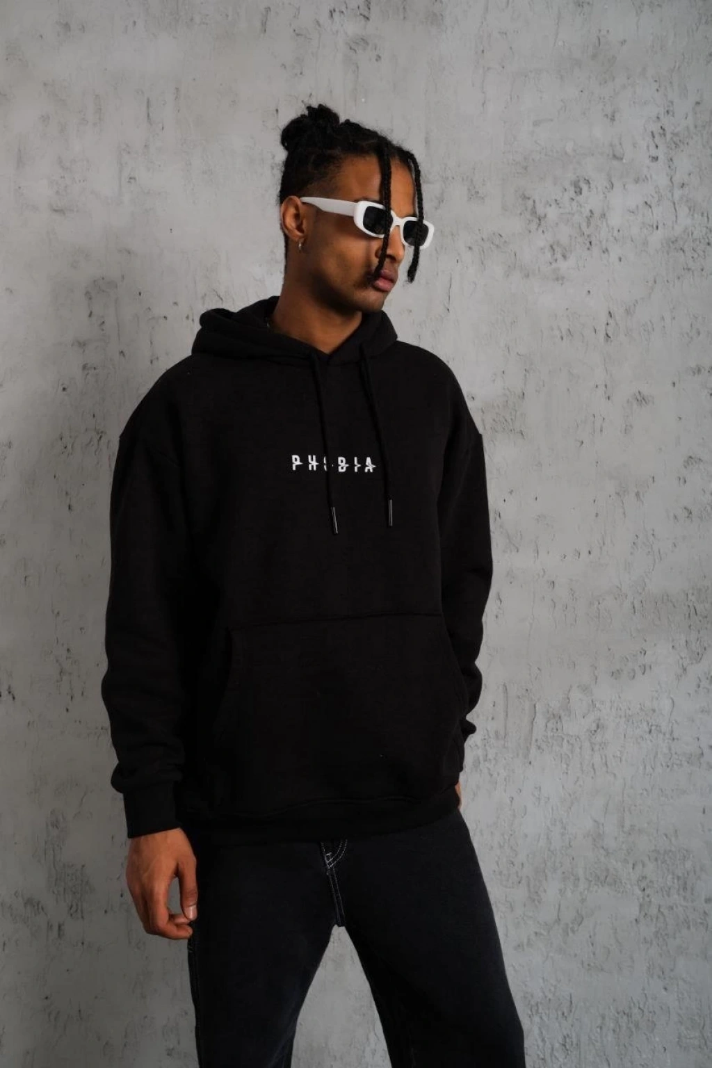 Erkek Oversize Üç İplik Kapüşonlu Sweatshirt – Siyah Sırt ve Ön Baskılı, Kanguru Cepli, Rahat Kalıp, İçi Pamuklu ModeL-Siyah
