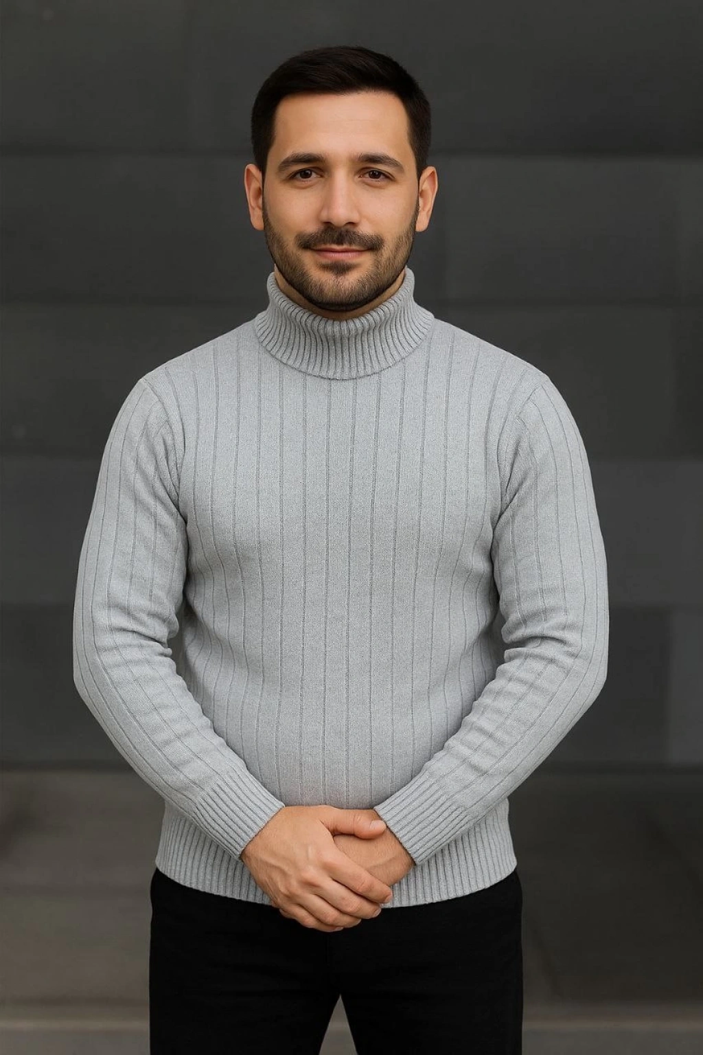 Erkek Fitilli Triko Kazak 2'li Set Gri Siyah Regular Balıkcı Yaka Tam Boğazlı Triko Seti Modeli Kazak