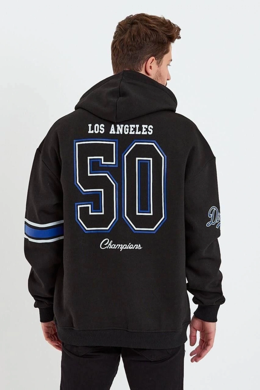 Erkek Premium Nakışlı Kapşonlu Sweatshirt Double Oversize Üç İplik Pamuklu - Siyah
