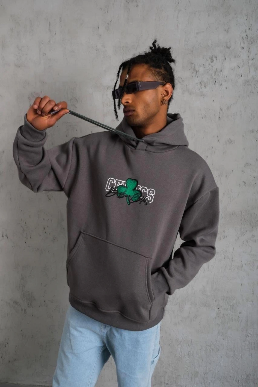 Erkek Nakış İşlemeli Kapşonlu Antrasit Sweatshirt Üç İplik Double Oversize- Füme