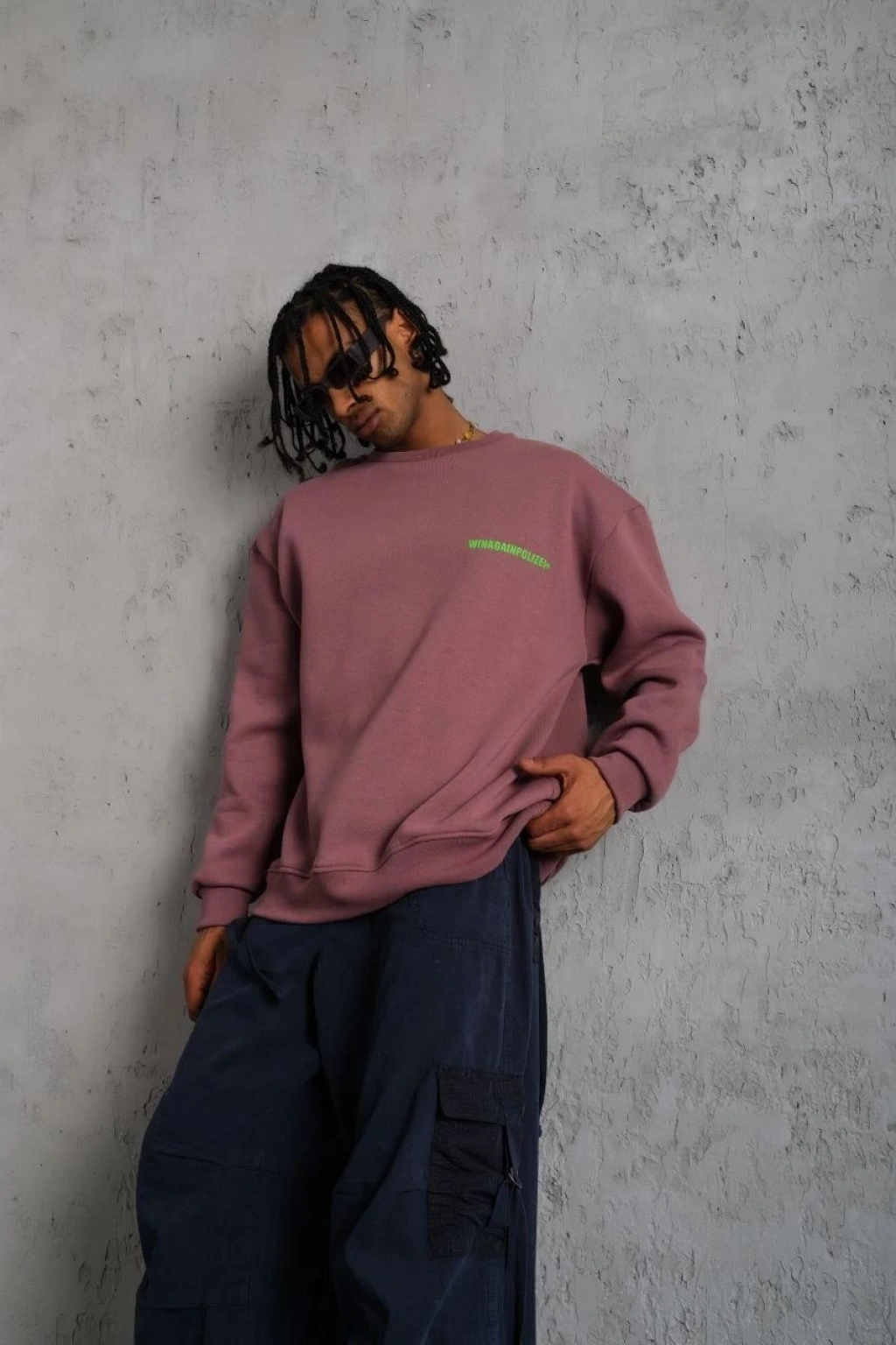 Erkek Patlı Yaka Üç İplik Pamuklu Sweatshirt Double Oversize Rahat Kalıp Günlük Kullanım - Füme