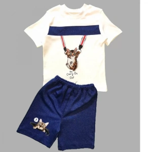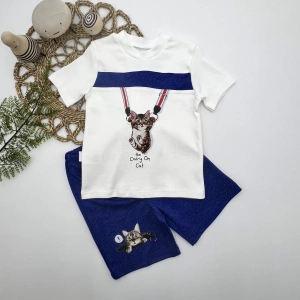 1-2-3 Yaş Fermuarlı Kedi Baskılı Şortlu Kısa Kollu Tişört 2Li Erkek Bebek Takımı İndigo
