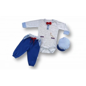 3-6 6-9 9-12 Ay Cep Saat Nakışlı Şapkalı Uzun Kollu Zıbınlı 3Lü Erkek Bebek Takımı Mavi
