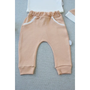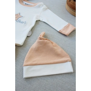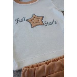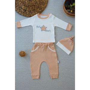 3-6 6-9 9-12 Ay Full Star Nakışlı Şapkalı Uzun Kollu Sweat 3Lü Erkek Bebek Takımı Buğday
