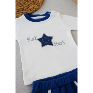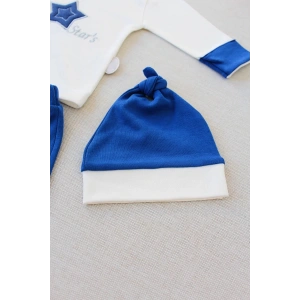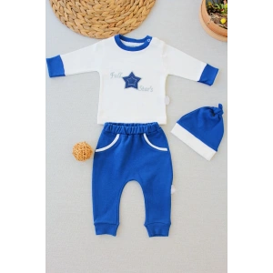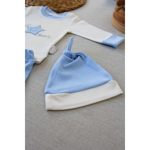 3-6 6-9 9-12 Ay Full Star Nakışlı Şapkalı Uzun Kollu Sweat 3Lü Erkek Bebek Takımı İndigo