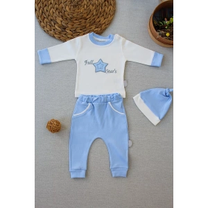 3-6 6-9 9-12 Ay Full Star Nakışlı Şapkalı Uzun Kollu Sweat 3Lü Erkek Bebek Takımı Mavi