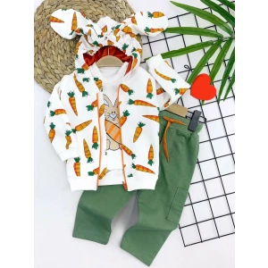 9-12-18-24 Ay Havuçlu Kulaklı Kapşonlu Fermuar Kapamalı 3Lü Erkek Bebek Takımı Ekru