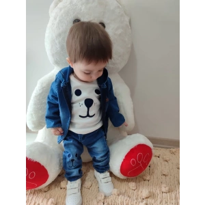9-12-18-24 Ay Kot Kumaş Kapşonlu Uzun Kol Sweatli Kot Kumaş 3Lü Erkek Bebek Takımı Mavi