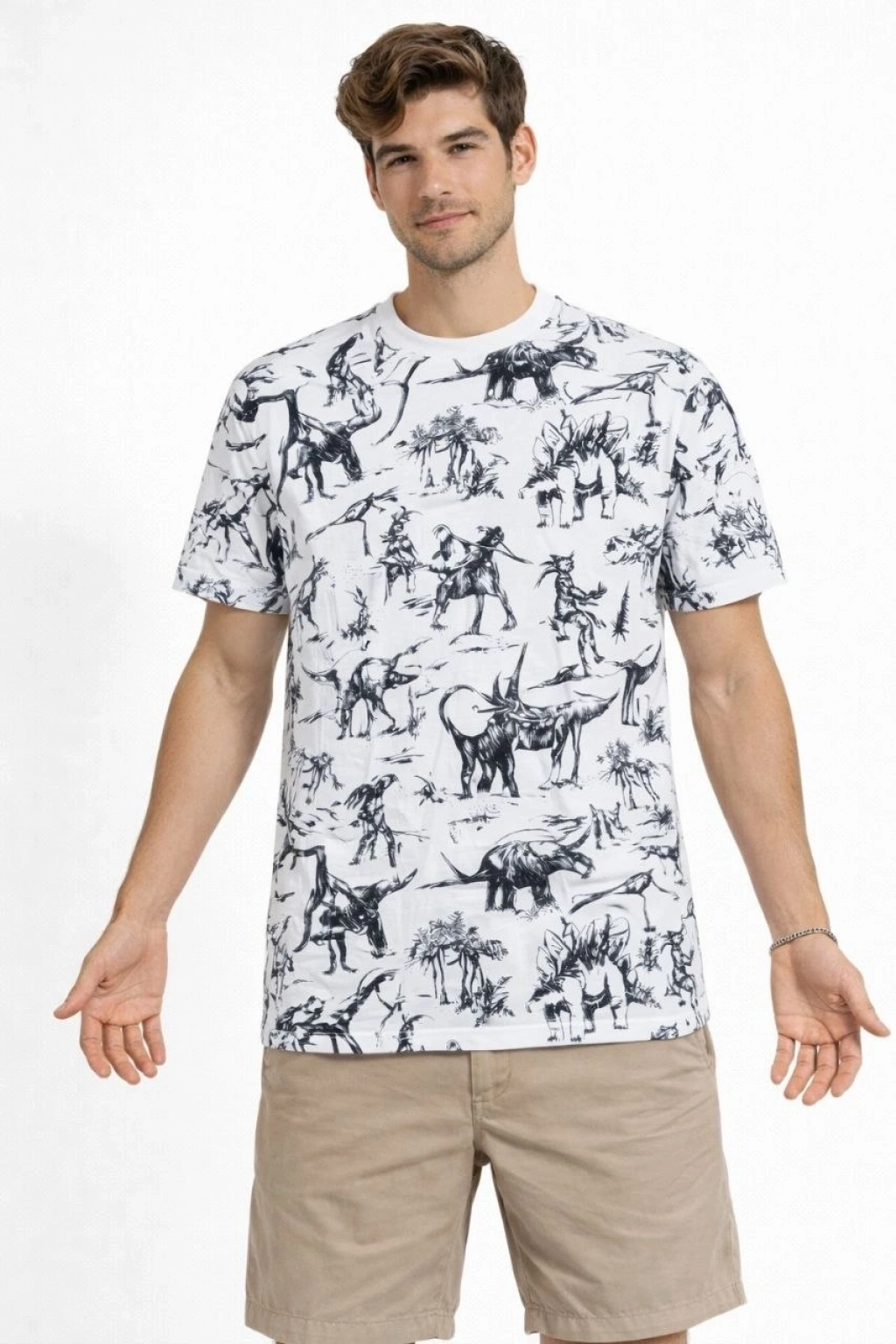 Erkek Asit Yıkamalı Oversize Tişört Mavi Kelebek Baskılı Dijital Print Bisiklet Yaka Streetwear T-Shirt - Beyaz
