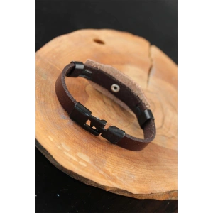 Siyah Deniz Çapalı Çelik Aksesuarlı Kahverengi Deri Erkek Bileklik