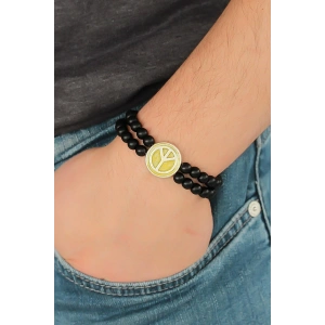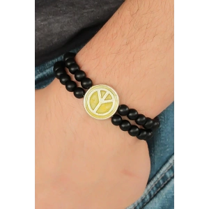 Sarı Metal Barış Simgesi Tasarımlı Siyah Renk Mat Oniks Doğal Taş Erkek Bileklik