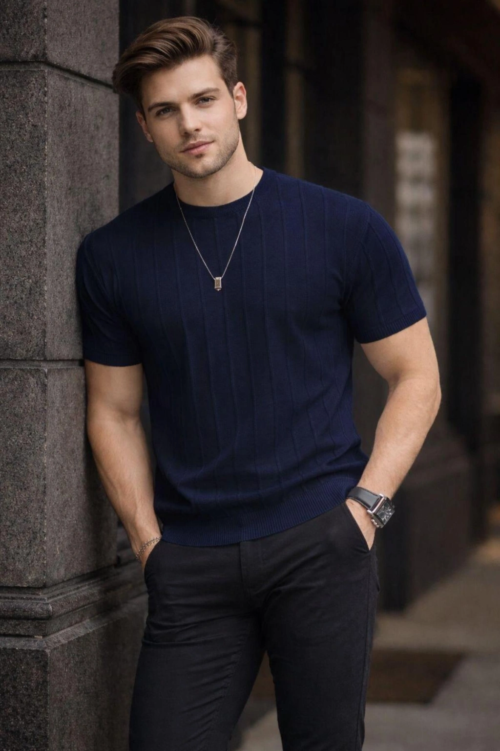 Erkek Bisiklet Yaka Dikine Çizgi Detaylı Yazlık Kısa Kollu Triko Tişört / T-shirt