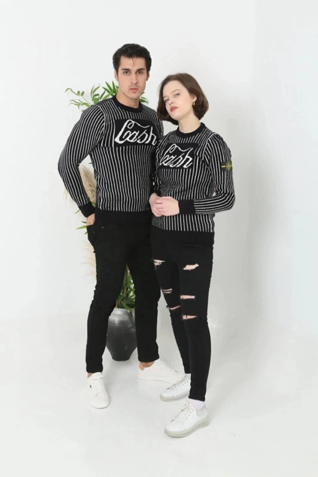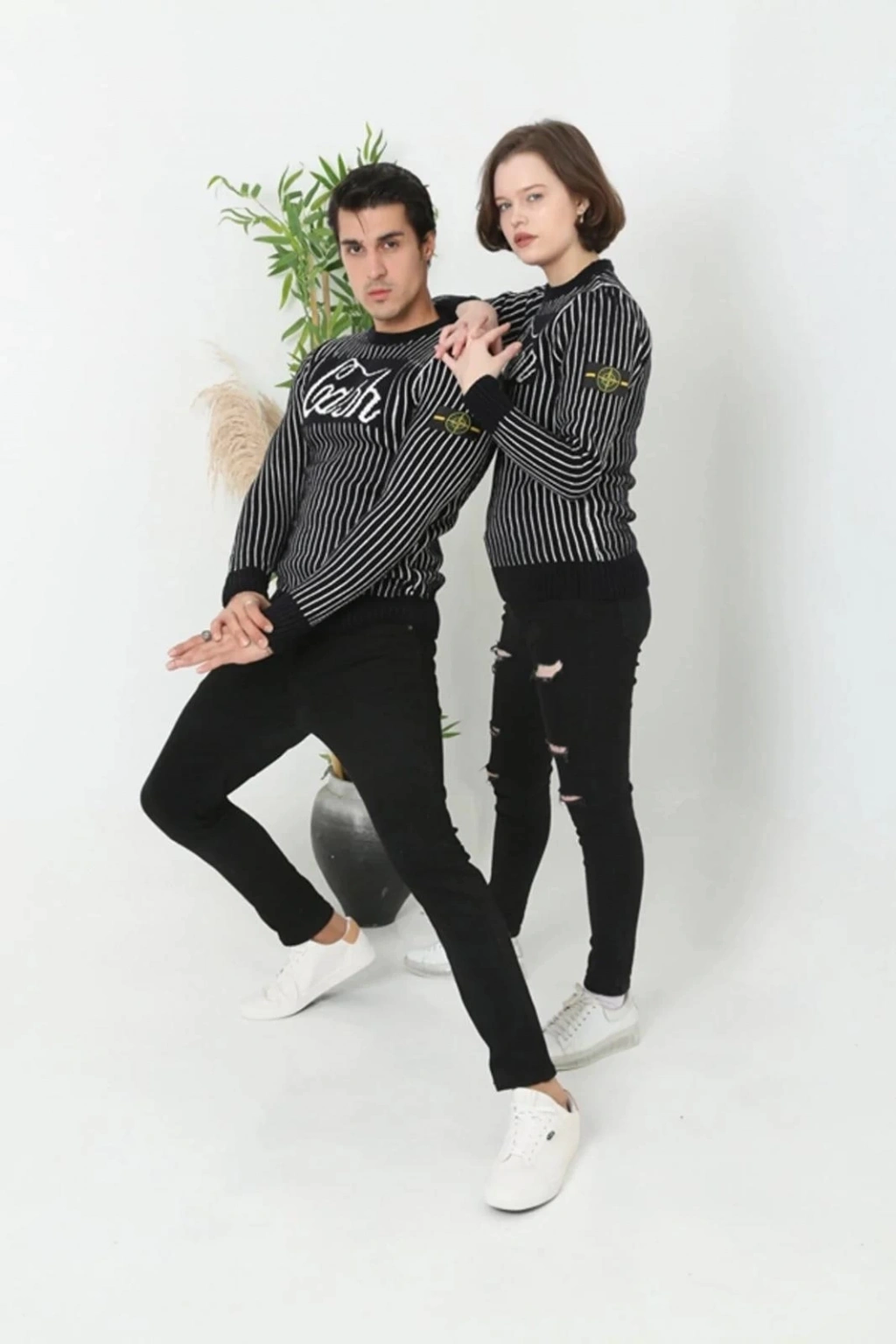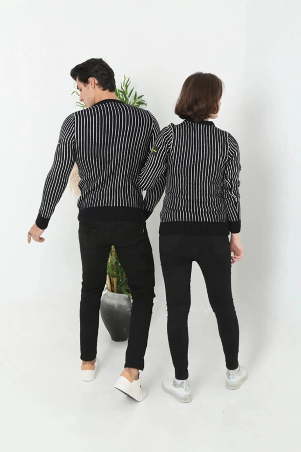 Unisex Yarım Boğazlı Baskılı Dokuma Triko - Siyah