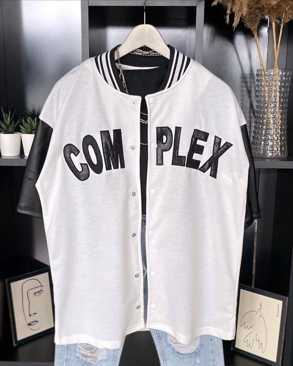 Erkek Complex Kolları Deri Kolej Oversize T-Shirt - Beyaz