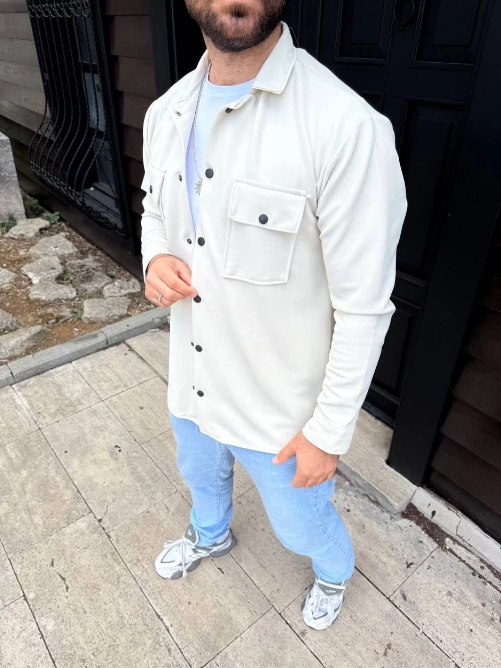 Erkek Diagonal Kumaş Cepli Çıtçıtlı uzun Kollu, Gömlek Oversize Rahat Kalıp Günlük Şık Stil - Bej