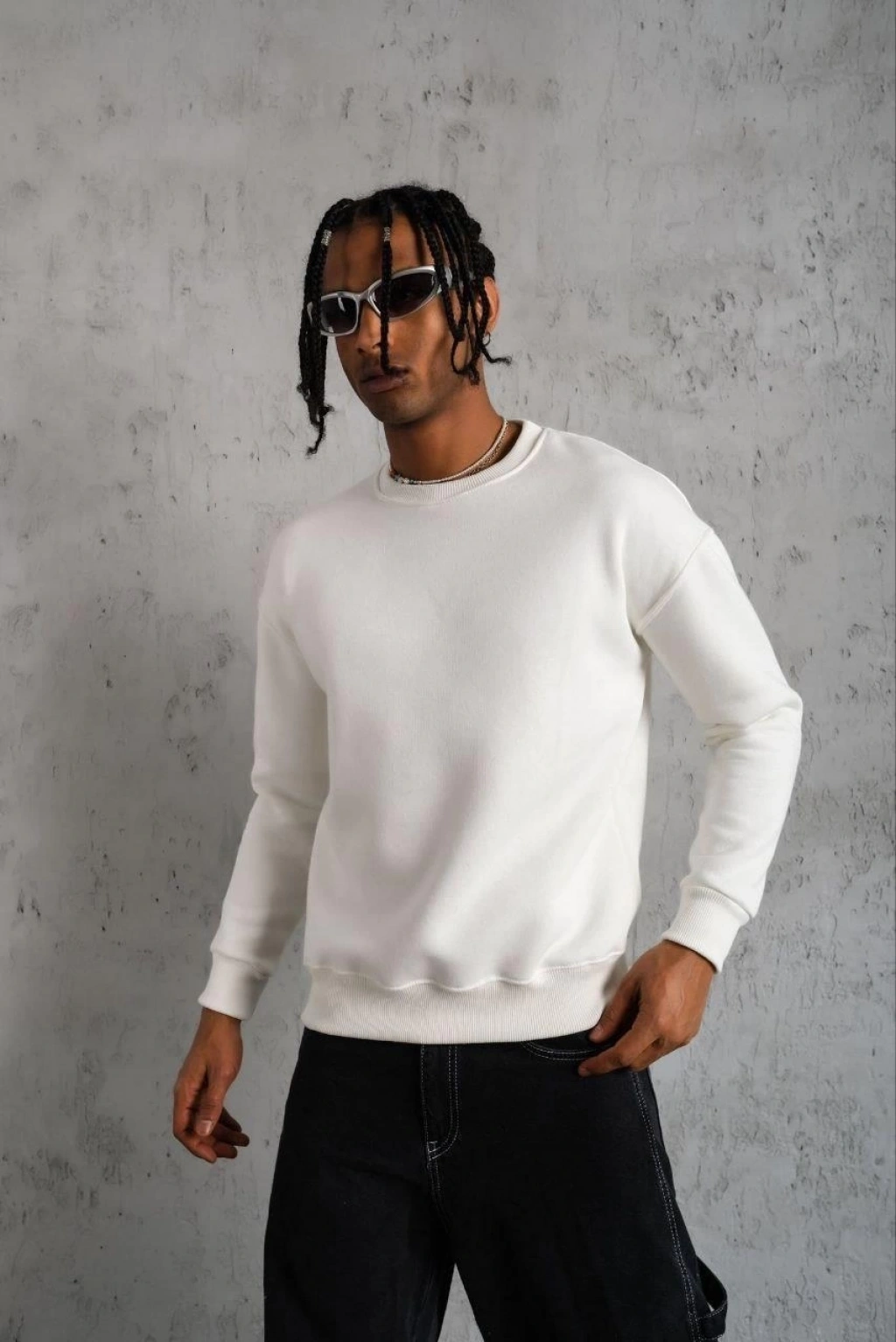 Erkek 3 İplik Pamuklu Yağ Yıkamalı Sweatshirt Double Oversize Bisiklet Yaka Uzun Kol - Krem