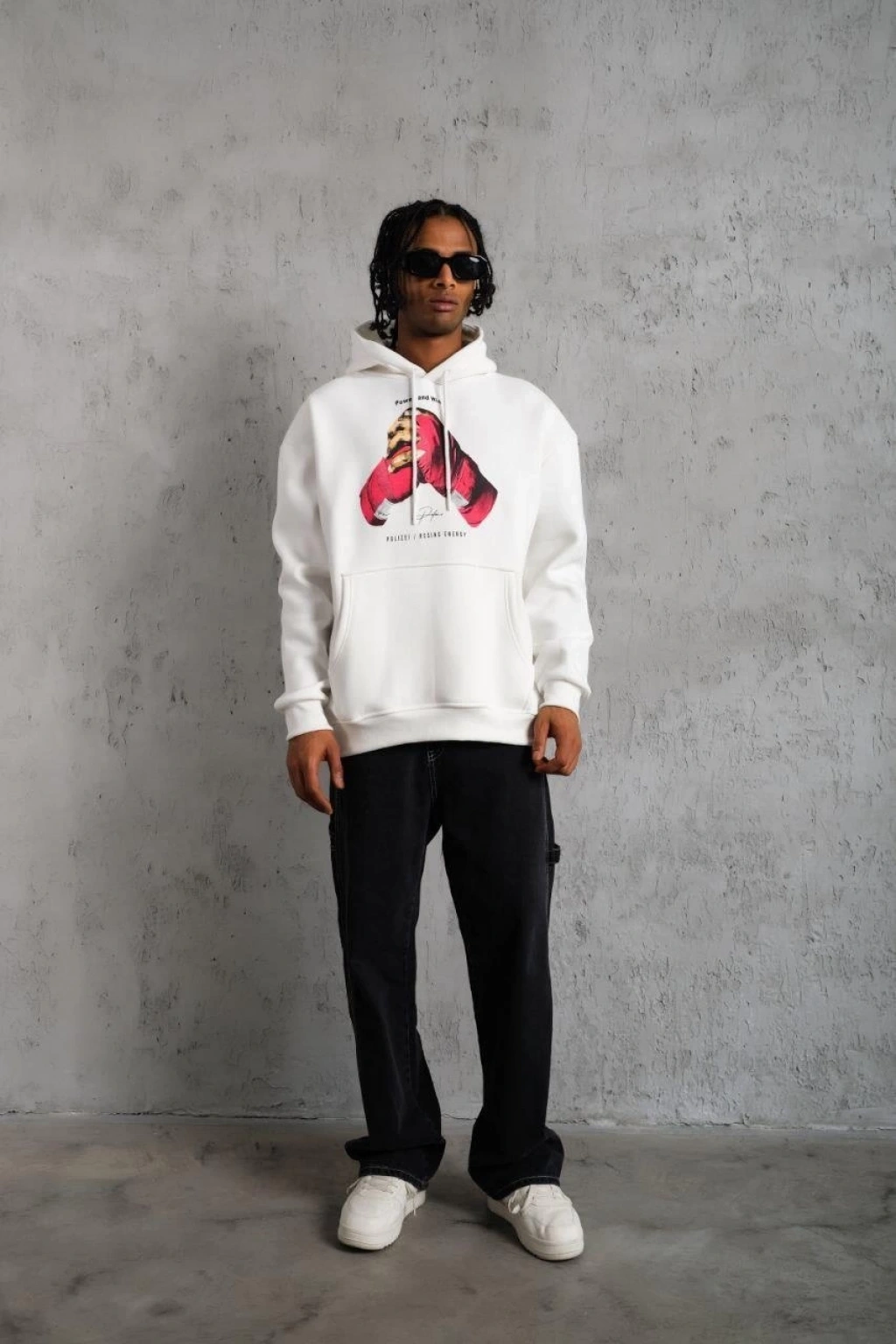 ERKEK OVERSİZE ÜÇ İPLİK KAPÜŞONLU SWEATSHİRT – BEYAZ ÖN BASKILI, KANGURU CEPLİ, RAHAT KALIP, İÇİ PAMUKLU MODEL