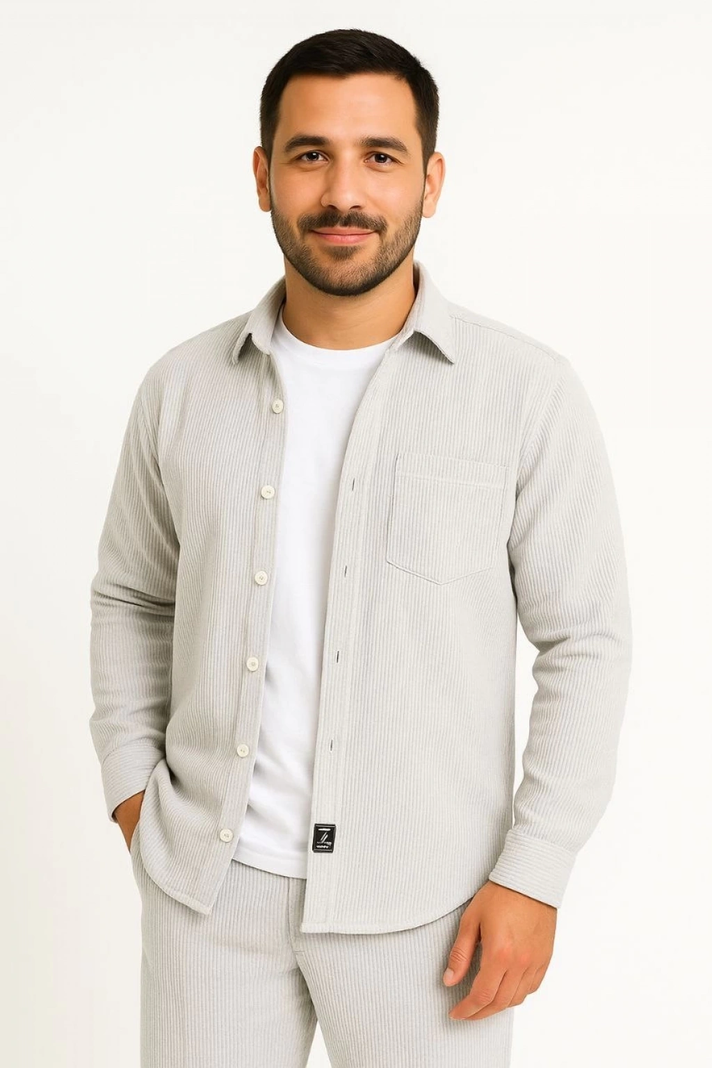 Erkek Diagonal Kumaş Cepli Çıtçıtlı uzun Kollu, Gömlek Oversize Rahat Kalıp Günlük Şık Stil - Beyaz