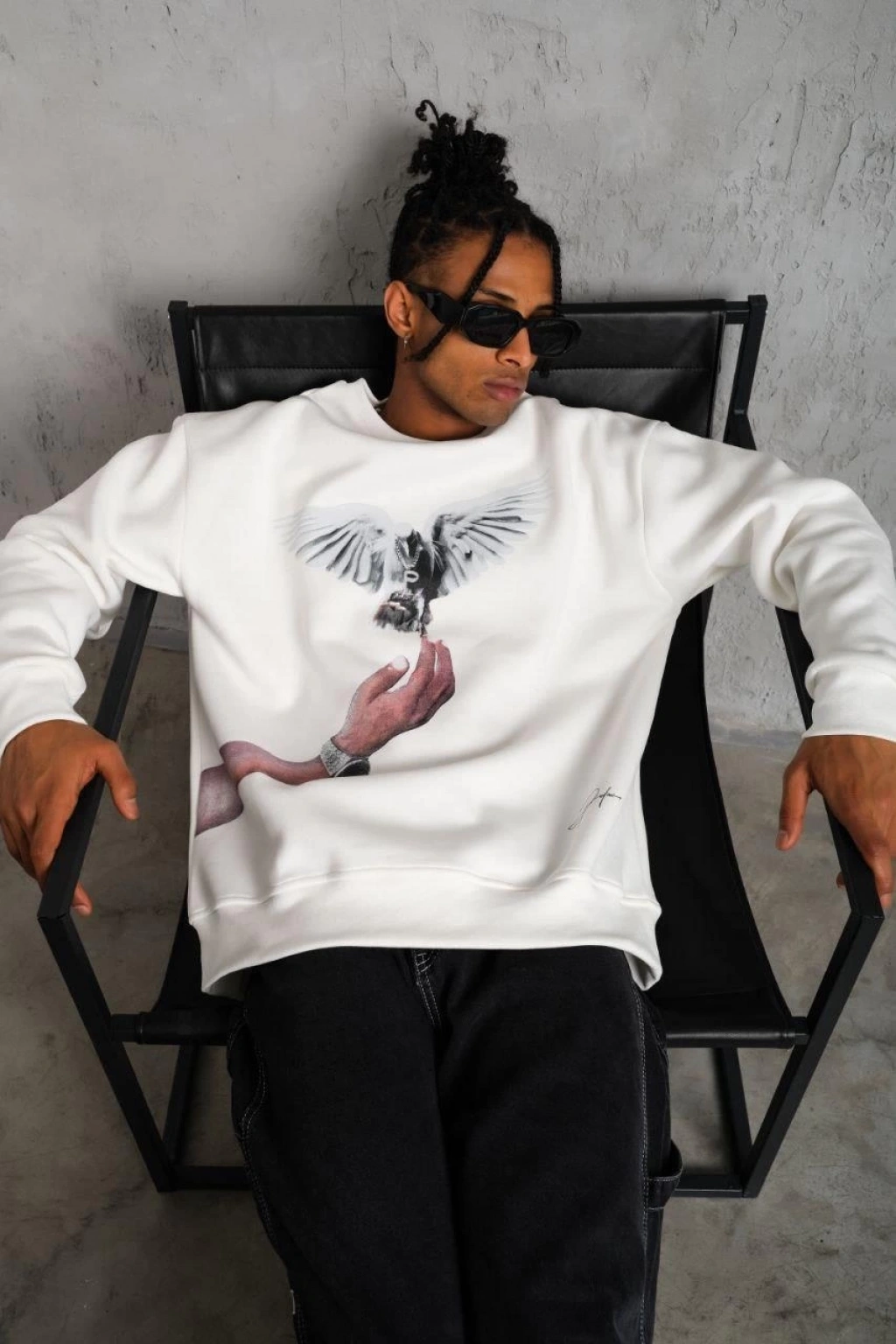 Erkek Güvercin Baskılı Sweatshirt - Beyaz