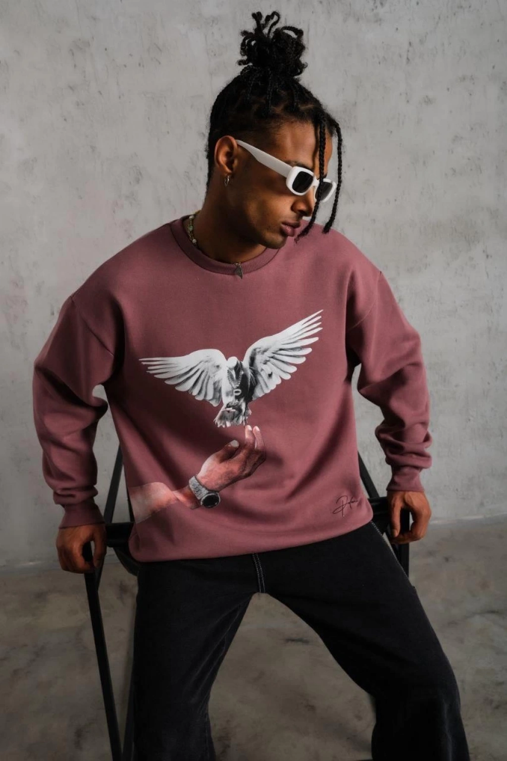 Erkek Patlı Yaka Üç İplik Pamuklu Sweatshirt Double Oversize Rahat Kalıp Günlük Kullanım - Füme