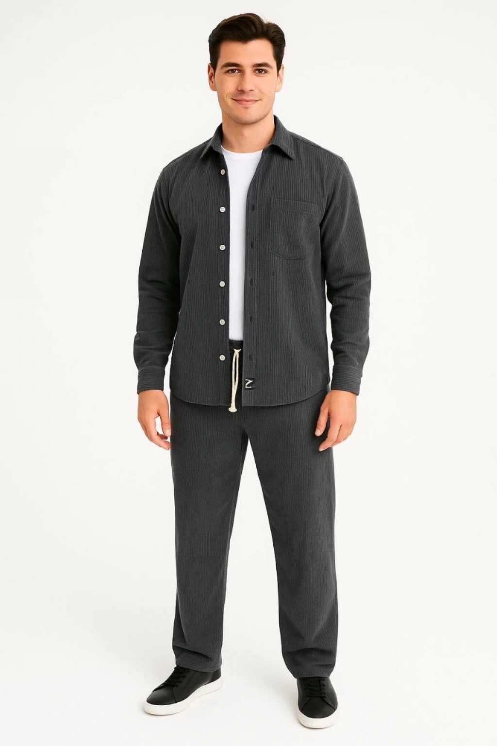 ERKEK KADİFE OVERSİZE TAKIM – GÖMLEK VE PANTOLON İKİLİ SET FÜME CORDUROY ŞIKLIĞI, RAHAT VE ZARİF DURUŞ YUMUŞAK DOKULU KADİFE KUMAŞ, DÜĞMELİ GÖMLEK ÜST VE LASTİKLİ PANTOLON ALT PARÇA İLE GÜN BOYU KONFOR- FÜME