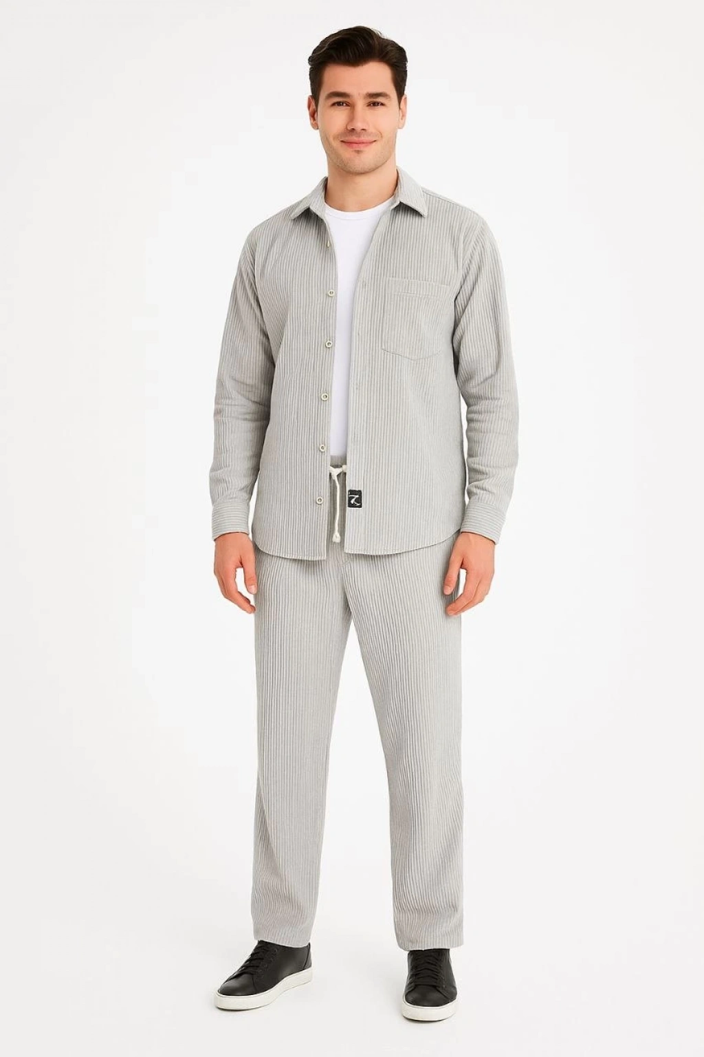 ERKEK KADİFE OVERSİZE TAKIM – GÖMLEK VE PANTOLON İKİLİ SET FÜME CORDUROY ŞIKLIĞI, RAHAT VE ZARİF DURUŞ YUMUŞAK DOKULU KADİFE KUMAŞ, DÜĞMELİ GÖMLEK ÜST VE LASTİKLİ PANTOLON ALT PARÇA İLE GÜN BOYU KONFOR- GRİ