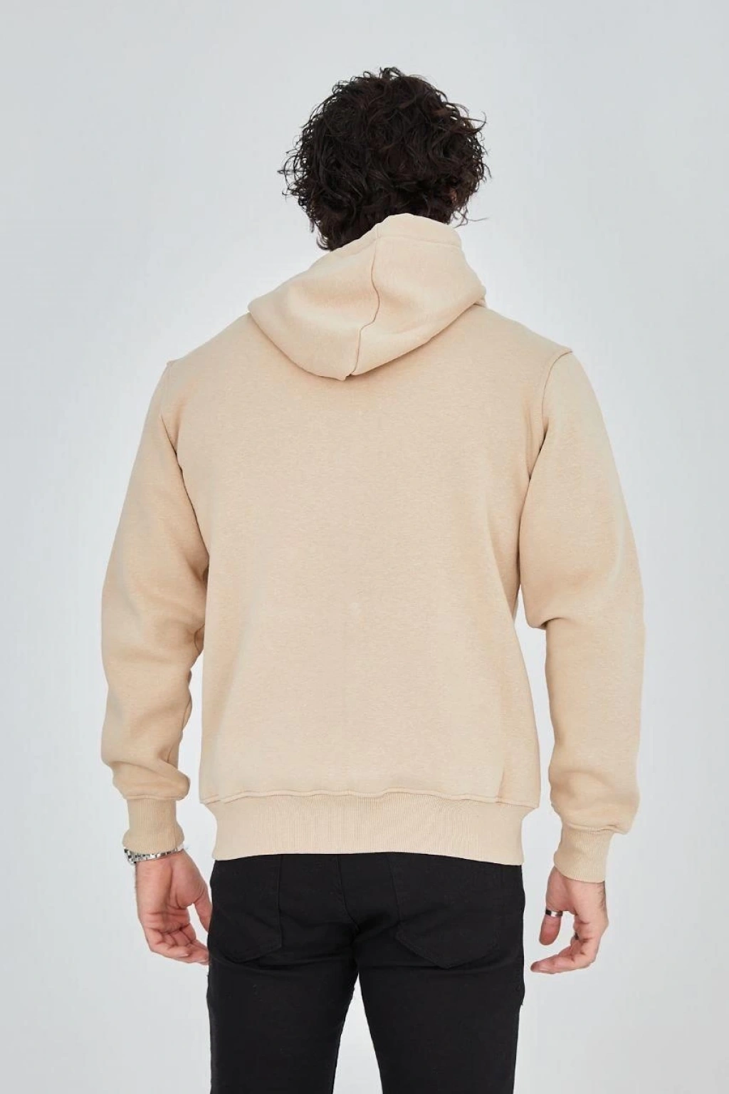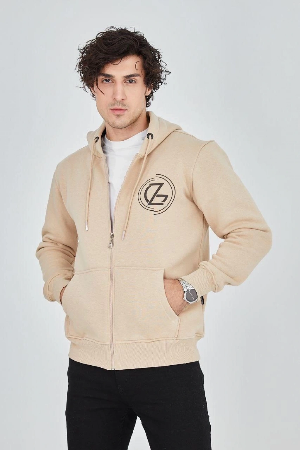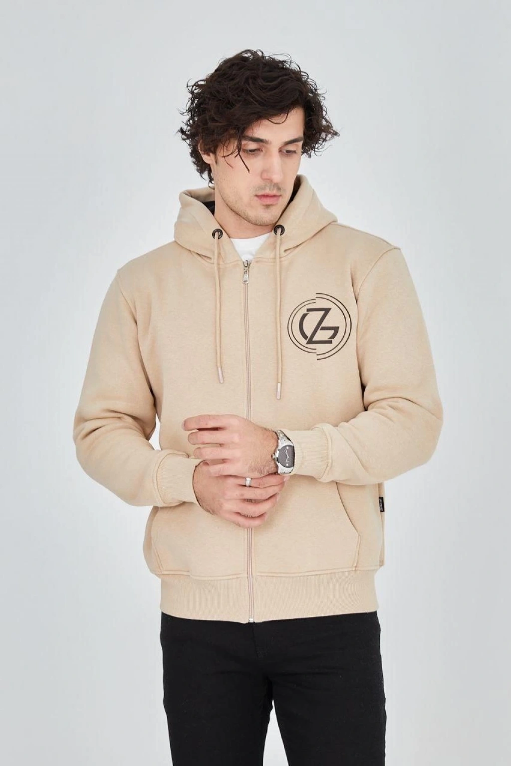 Erkek Kapüşonlu Düz Fermuarlı Hırka - Bej