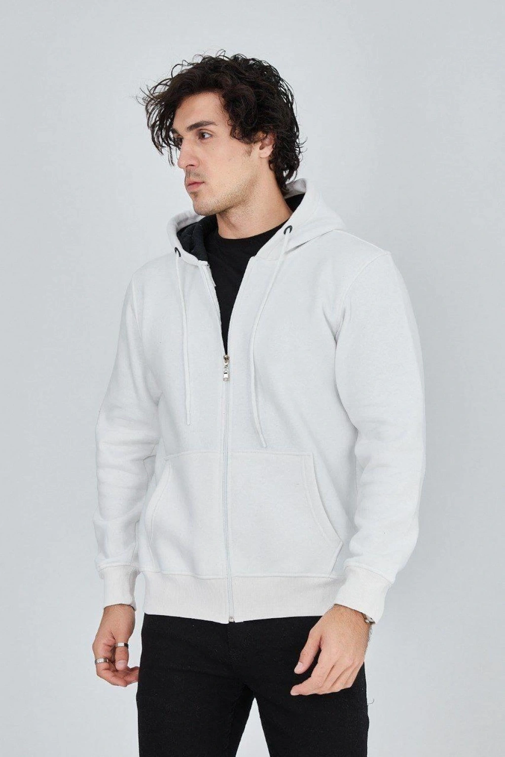 Erkek Kapüşonlu 3 İplik Şardonlu Önü Baskılı Fermuarlı Oversize Sweatshirt - Beyaz