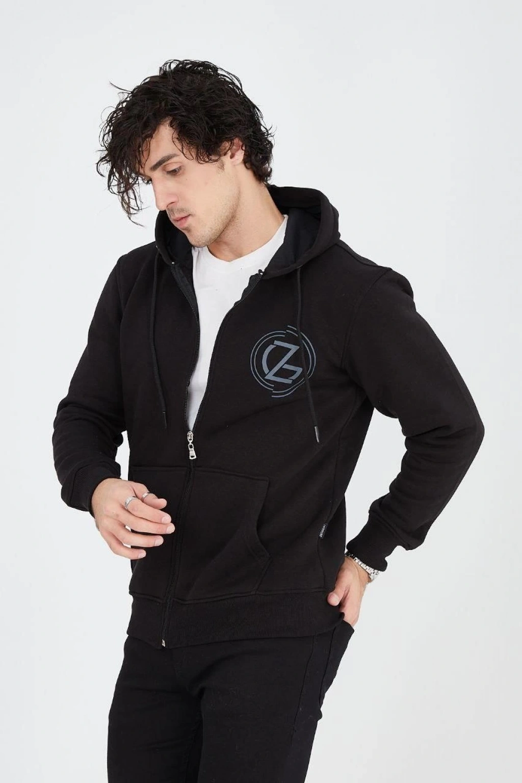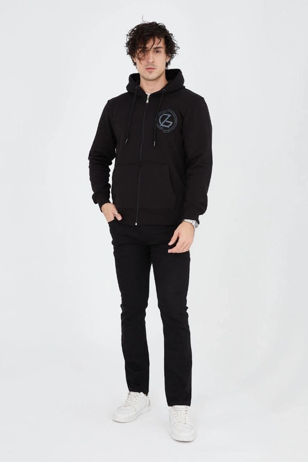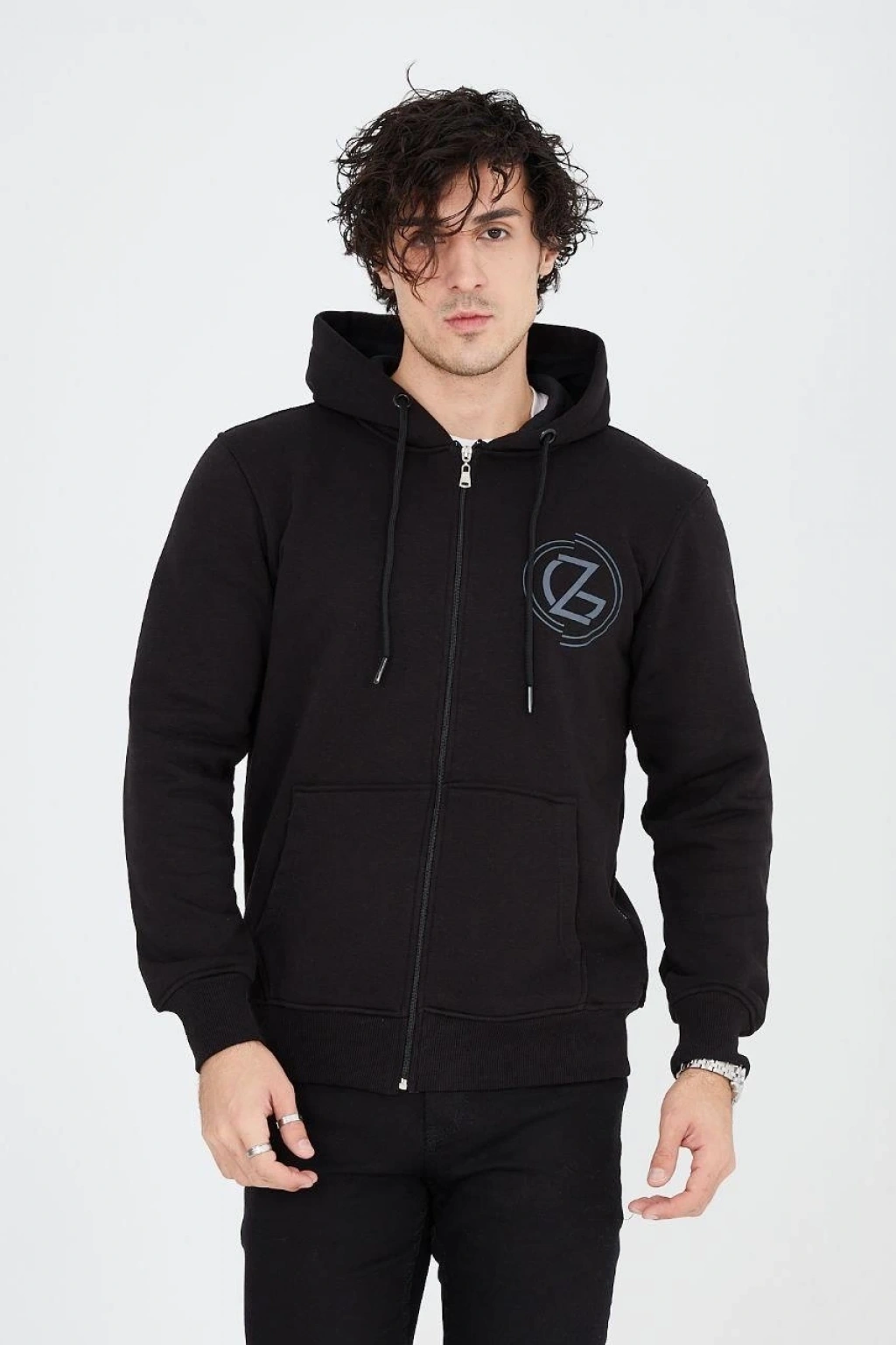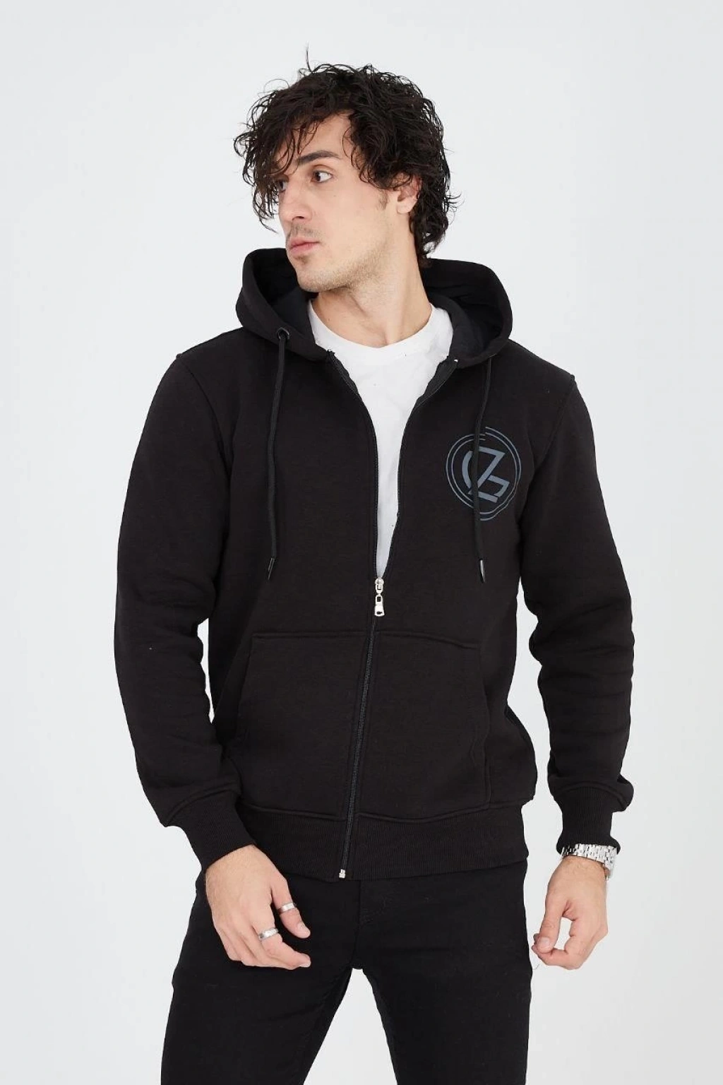 ERKEK OVERSİZE DİK YAKA FERMUARLI SWEATSHİRT - ZİNCİR NAKIŞLİ KANGURU CEPLİ - SİYAH