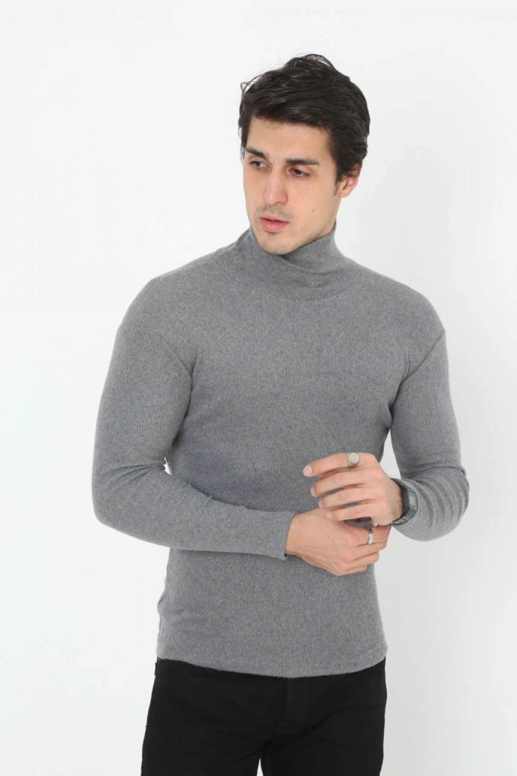 Erkek Kaşkorse Boğazlı Full Likralı Fitilli Body Kazak - Gri