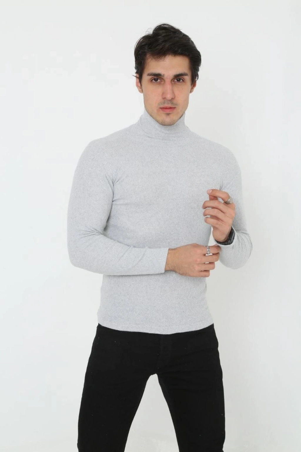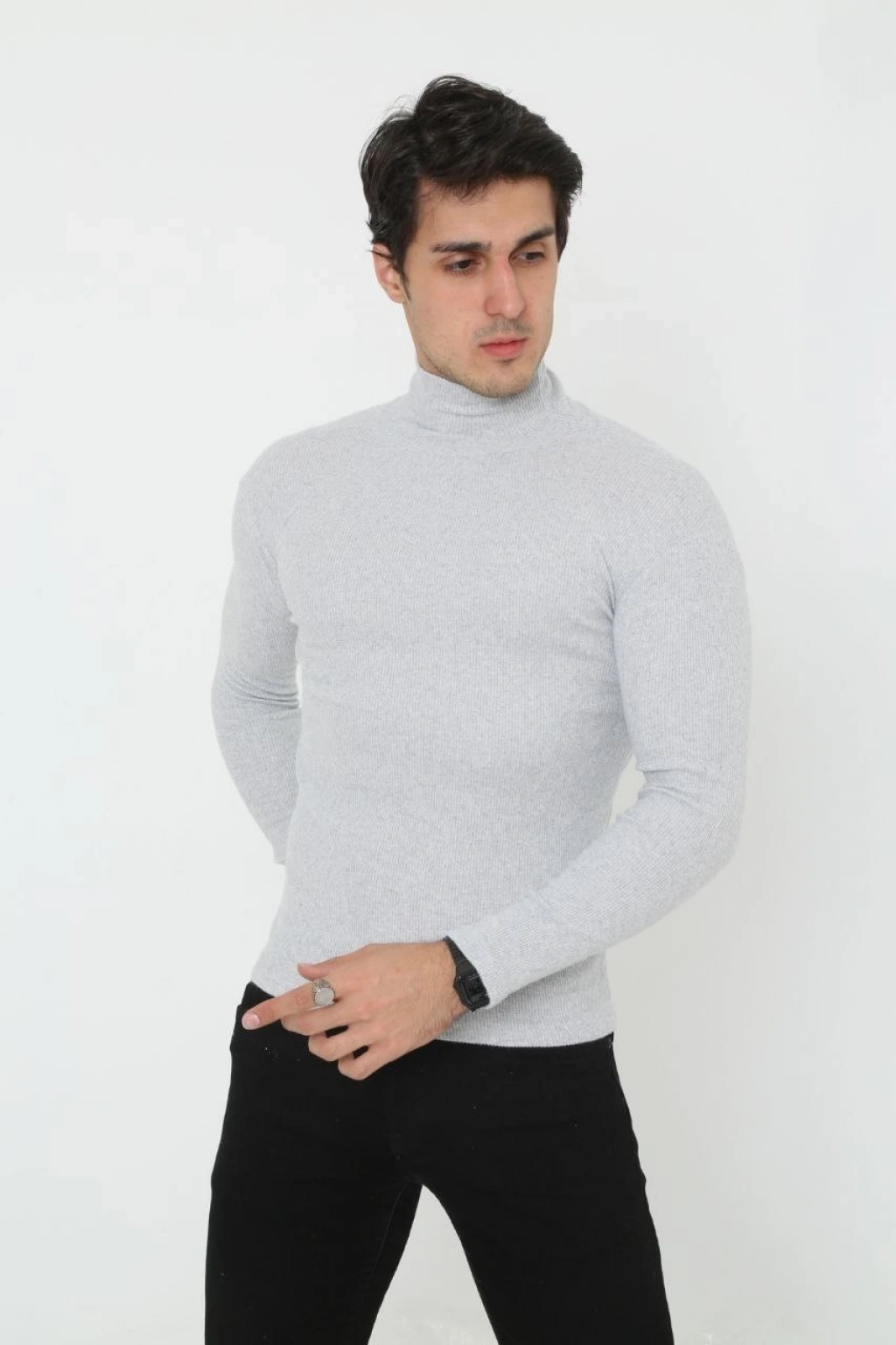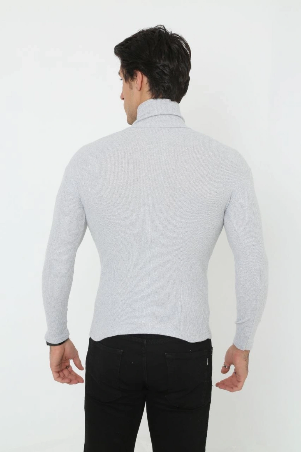Erkek Kaşkorse Boğazlı Full Likralı Fitilli Body Kazak - Gri