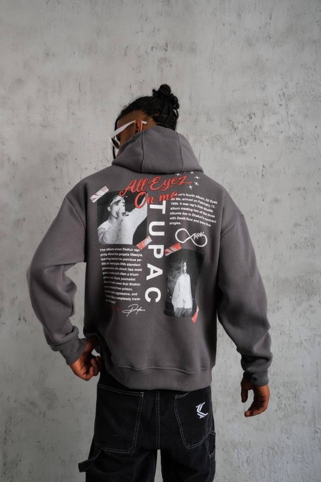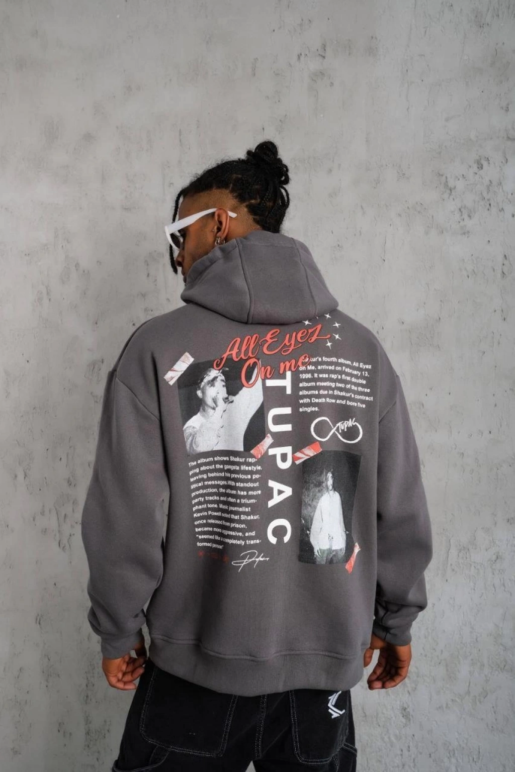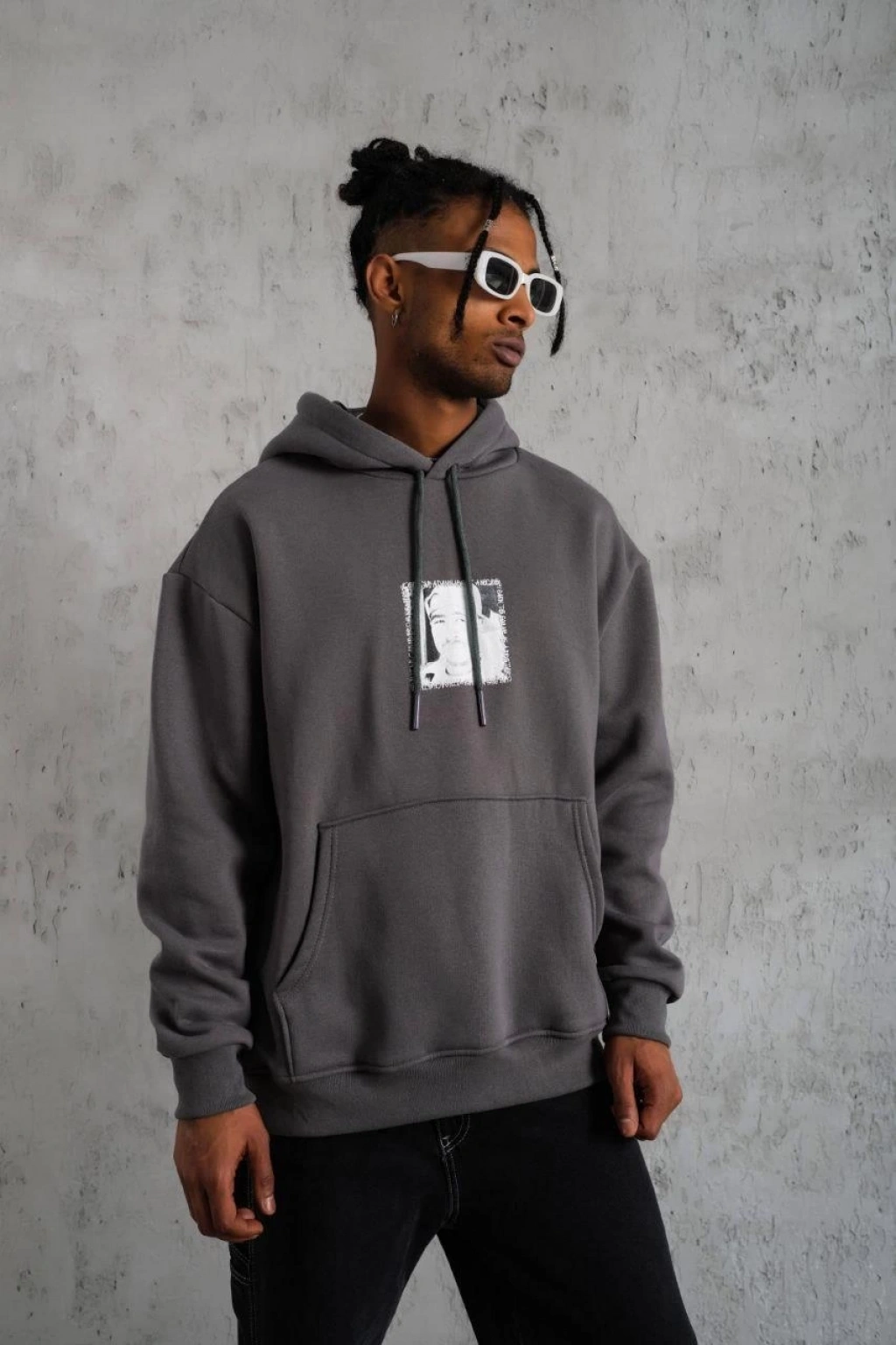 Erkek Nakış İşlemeli Kapşonlu Antrasit Sweatshirt Üç İplik Double Oversize- Füme