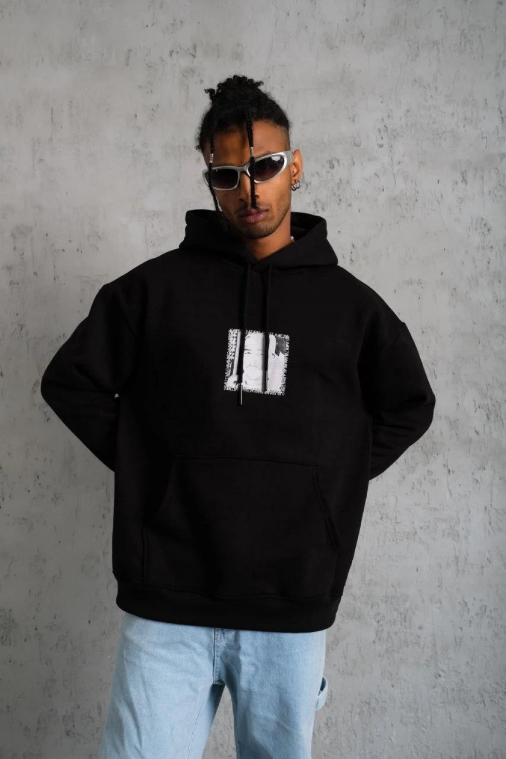 Erkek Premium Nakışlı Kapşonlu Sweatshirt Double Oversize Üç İplik Pamuklu - Siyah