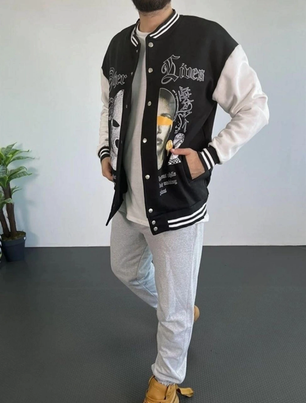 Unisex Siyah Bomber Mont – Beyaz Şimşek Desenli, Fermuarlı Cepli, Kapitone Astarlı Sokak Stili Günlük Ceket - Siyah