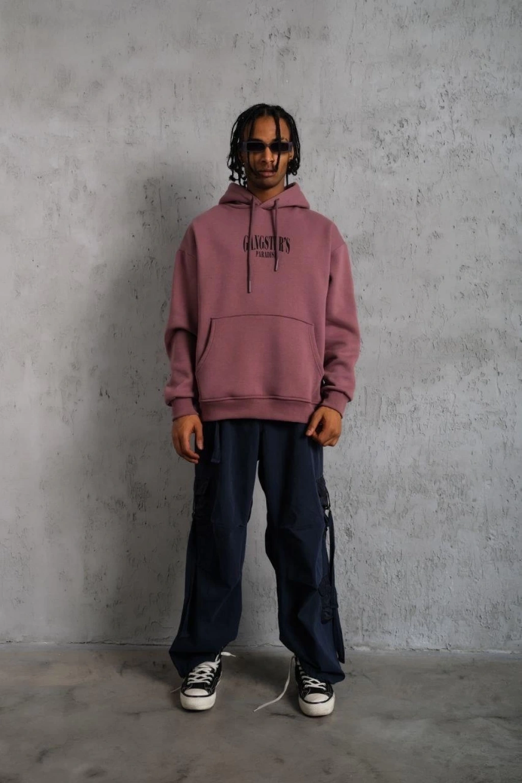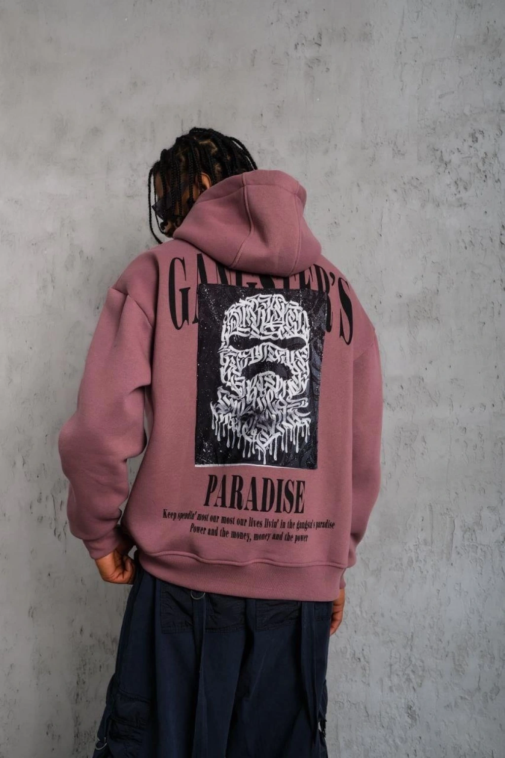 Erkek Nakış İşlemeli Kapşonlu Antrasit Sweatshirt Üç İplik Double Oversize- Füme