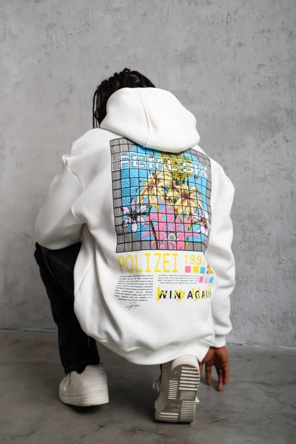 ERKEK OVERSİZE SWEATSHİRT – BEYAZ RENK | ÖN VE SIRT BASKILI, ÜÇ İPLİK İÇİ PAMUKLU KUMAŞ, RAHAT KALIP, RİBANALI KIŞLIK SWEAT | WİNAGAİN POLİZEİ SERİSİ - BEYAZ