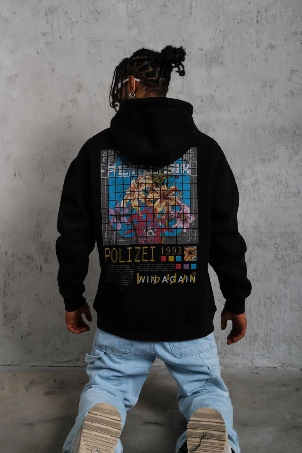Erkek Oversize Üç İplik Kapüşonlu Sweatshirt – Siyah Sırt ve Ön Baskılı, Kanguru Cepli, Rahat Kalıp, İçi Pamuklu ModeL-Siyah