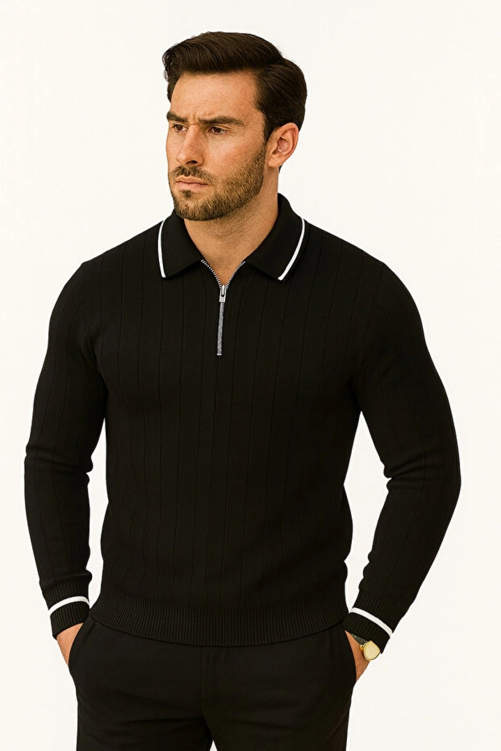 Erkek Polo Yaka Yarım Fermuarlı Regular Fit Kalıp Basic Düz Triko Kazak