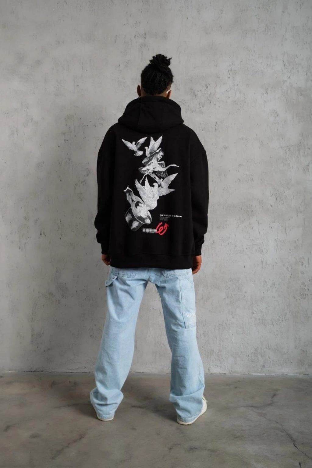 Erkek Premium Nakışlı Kapşonlu Sweatshirt Double Oversize Üç İplik Pamuklu - Siyah