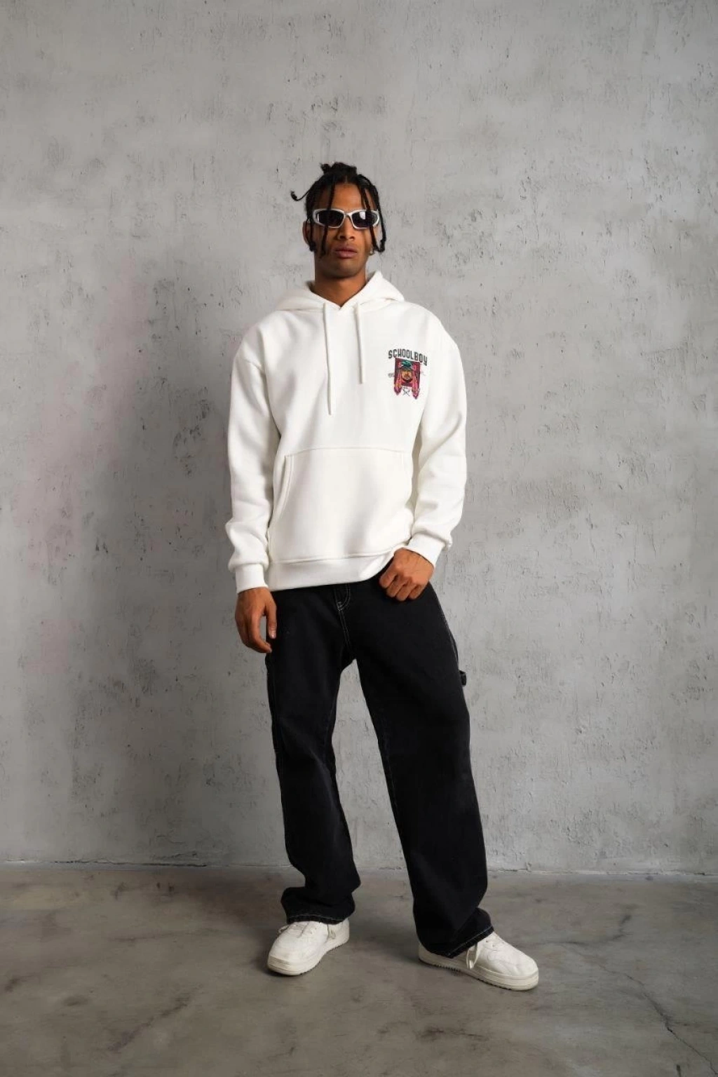 Erkek Premium Nakışlı Kapşonlu Sweatshirt Double Oversize Üç İplik Pamuklu - Siyah