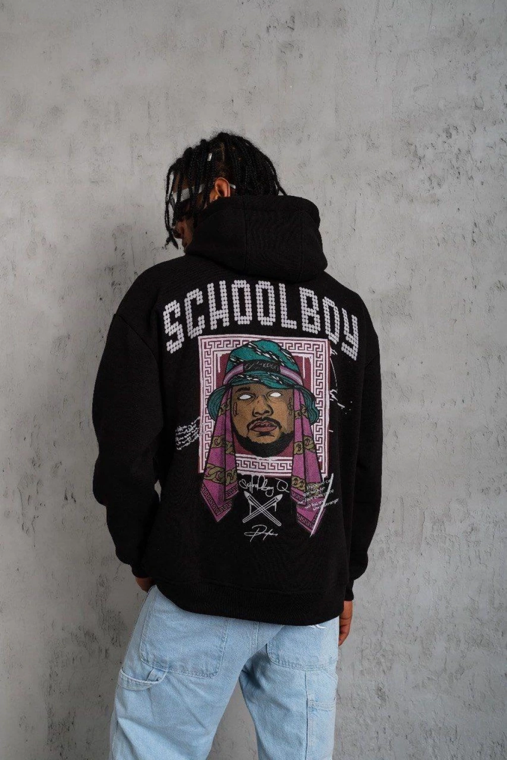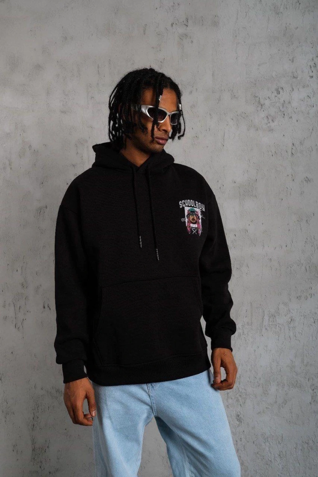 Erkek Premium Nakışlı Kapşonlu Sweatshirt Double Oversize Üç İplik Pamuklu - Siyah