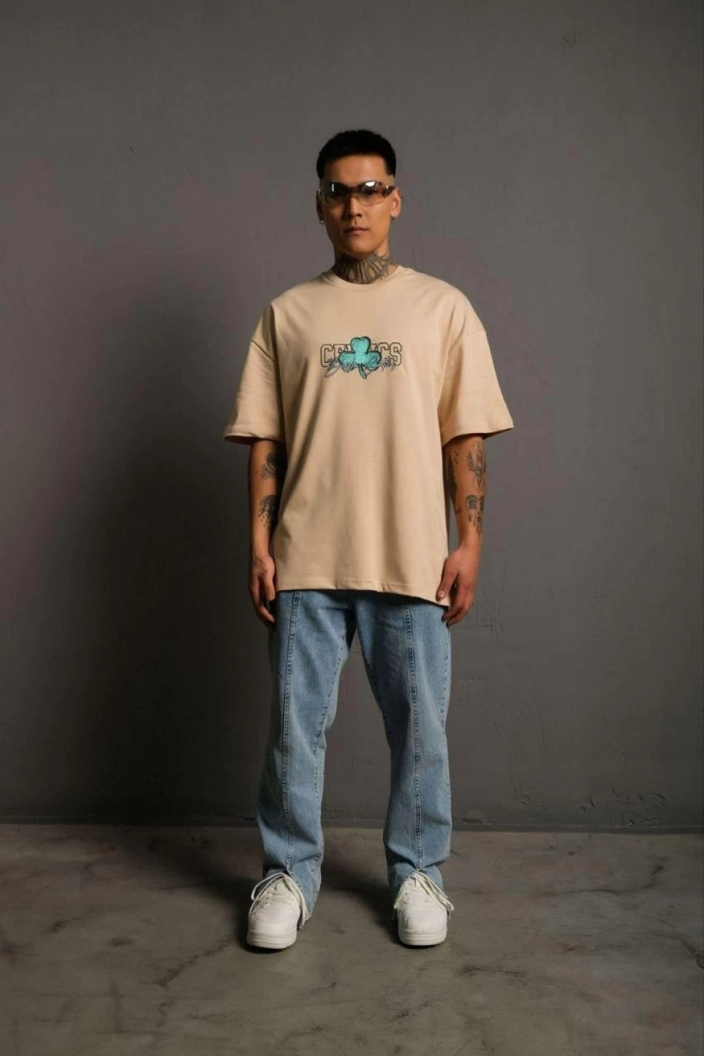 Erkek Nihilist Penguen Temalı Oversize Bisiklet Yaka Tişört - Beyaz