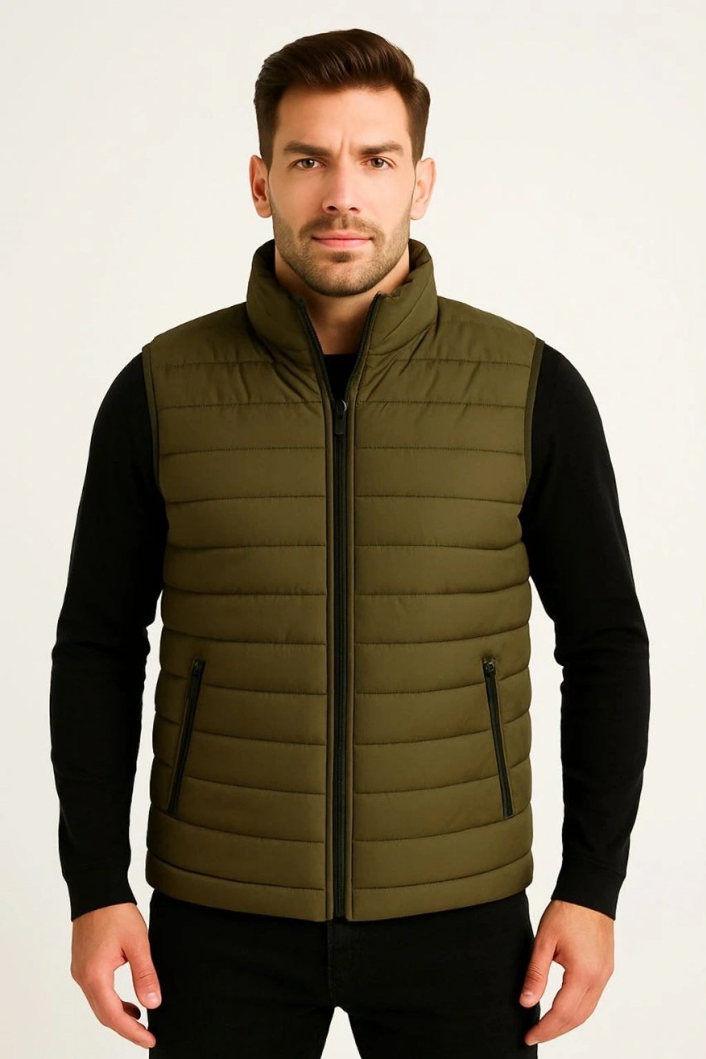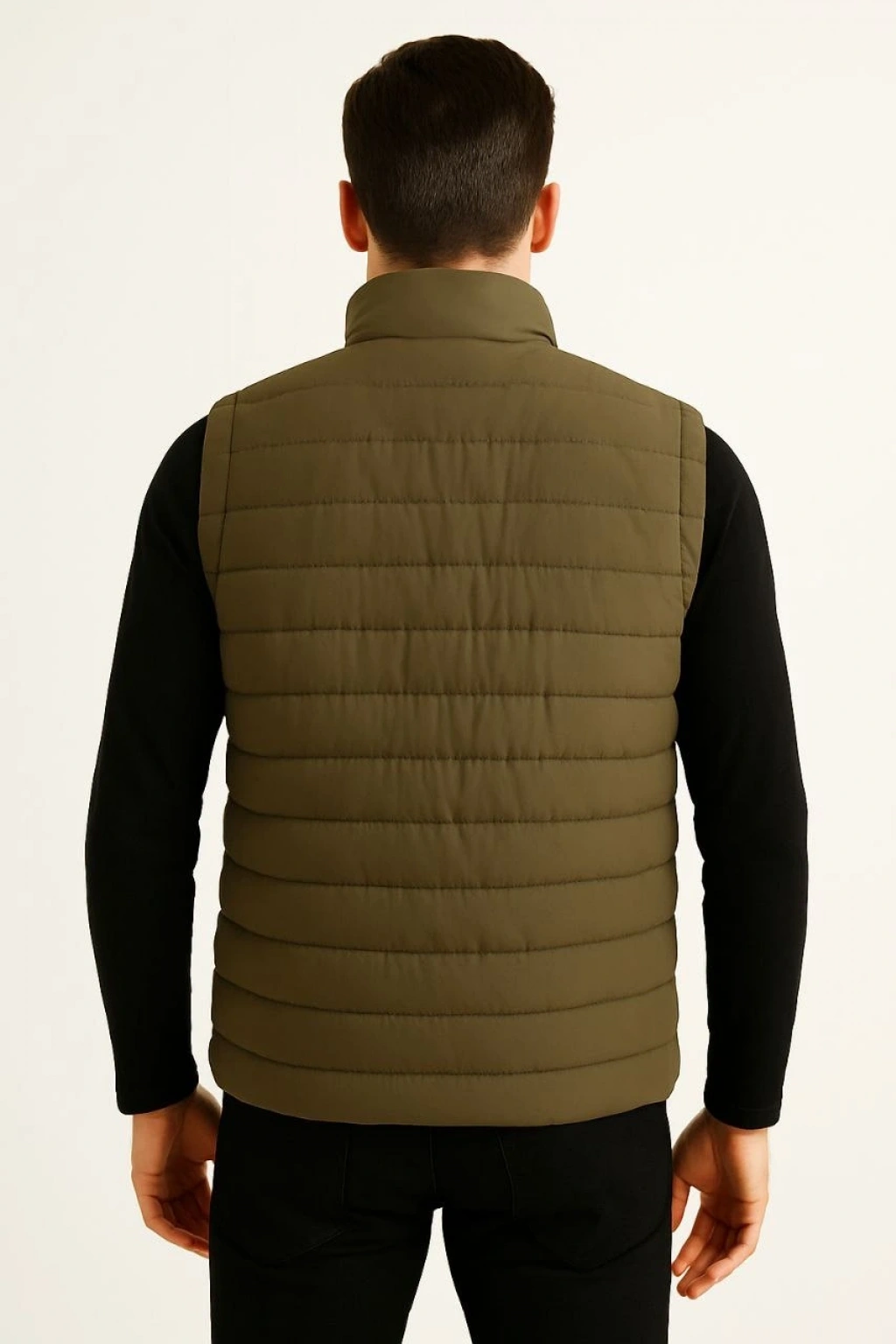 ERKEK ŞİŞME FERMUARLI YELEK SU İTİCİ KAPİTONE ASTARLI KUMAŞ CEPLİ HAFİF KIŞLIK SPOR RAHAT KALIP -BEJ
