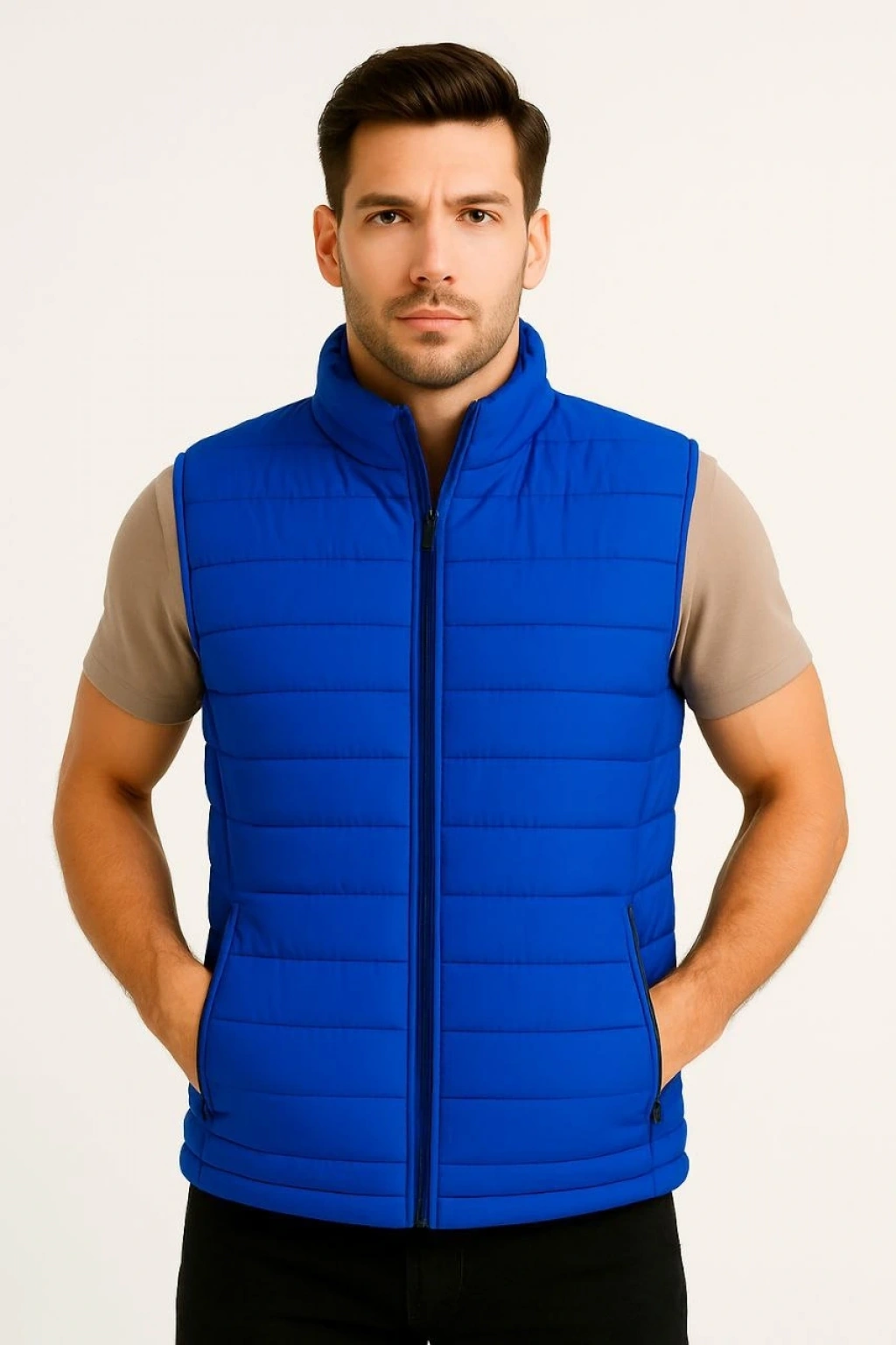 Erkek Şişme Fermuarlı Yelek Su itici Kapitone Astarlı Kumaş Cepli Hafif Kışlık Spor Rahat Kalıp -Bej